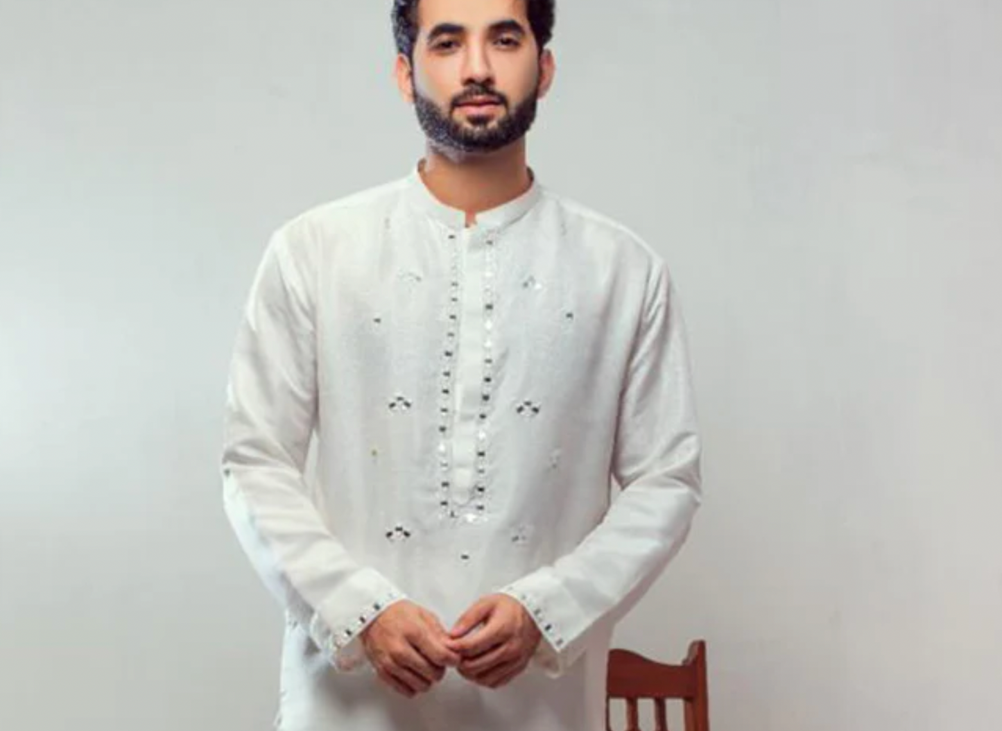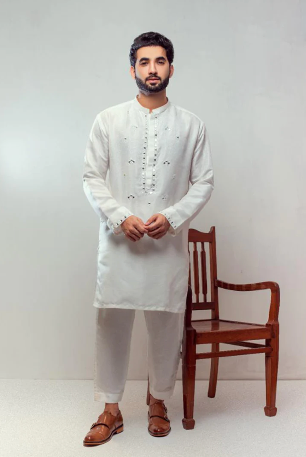 off white cotton silk kurta with pyjamas front mirror work on the Kurta and on sleeves.
