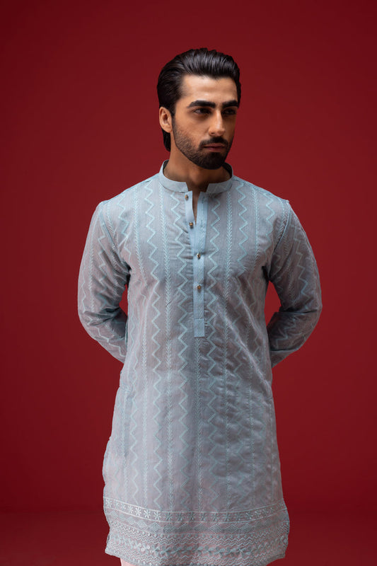 Men's designer kurta Cloud Grey Cotton Silk Kurta Embroidery with Pyjama